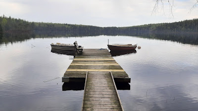 Sjön såg härligt inbjudande när vi kom dit ,Berth-Arne och jag. Riggade till flugspöna och embarkerade varsin båt. Vår vana trogen börjar vi alltid med att släpa en fluga på intermediate lina i sakta mak. Jag kom bara en liten bit innan det small på en fin RB som efter några snabba rusningar inte ville vara med längre.Bara en liten stund senare tappar Berth-Arne en fisk. Nu rodde vi bort mot lä-viken på andra sidan, släppte ankaret där och fiskade under någon timma. Inte ett liv.